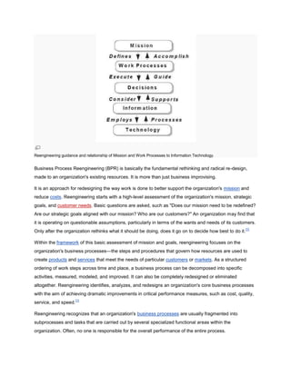 Business process reengineering (BPR) involves analyzing and designing organizational workflows and processes to achieve dramatic improvements. A business process is a set of related tasks that create value for customers. BPR focuses on fundamentally rethinking processes rather than incremental improvements. It aims to eliminate non-value adding work and optimize processes using information technology.