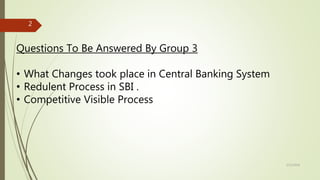 The document discusses business process re-engineering at State Bank of India. It provides details on the merger of SBI with its associate banks, including redundant processes, competitive advantages, and changes in central banking, retail banking, rural banking, and wholesale banking. Challenges of the merger include integrating a large number of branches and employees, resolving high levels of bad loans, and ensuring customer satisfaction during the transition period. The document also outlines improvements made by SBI and further areas for improvement post-merger.