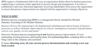 Business Process Re-engineering (BPR) is a management strategy that aims to improve organizational performance by redesigning and optimizing core business processes. It takes a systematic and radical approach to change that is focused on transforming processes to achieve improvements in quality, efficiency, and customer satisfaction. BPR involves comprehensively analyzing existing processes, identifying inefficiencies, and developing new improved processes aligned with strategic objectives. The goal is to eliminate unnecessary steps, reduce cycle times, and maximize customer value. Potential benefits include reduced costs, increased productivity and quality, and faster times. However, implementing BPR can also be complex and challenging.