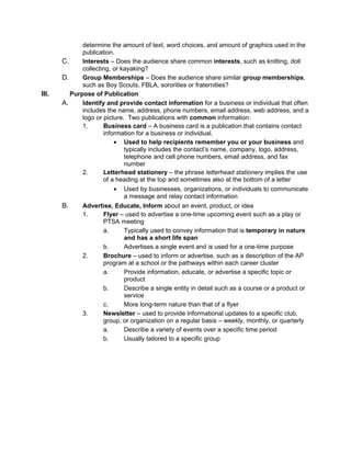 This document discusses important principles for effective business publications, including design, audience, and purpose. It notes that publications must grab attention, present information attractively and concisely. Key design principles are balance, proximity, alignment, repetition, contrast and white space. Understanding the target audience's age, education, interests and groups helps appeal to them. Publications' purposes include providing contact information, advertising events/products, and informing groups through newsletters.