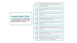 The document outlines the development of business requirements, detailing classifications, development stages, and the importance of a Business Requirements Document (BRD). It emphasizes understanding stakeholder needs, the distinction between business and functional requirements, as well as effective elicitation techniques to minimize errors in requirement gathering. Key challenges, best practices, and common faults are also discussed to ensure successful project outcomes.
