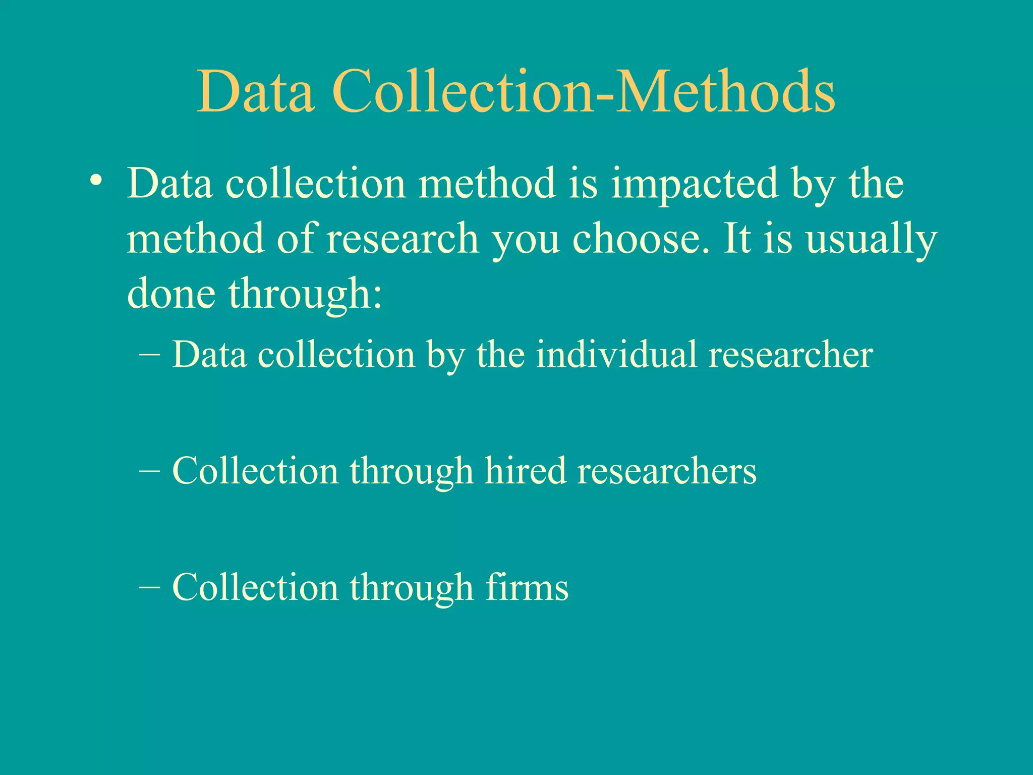 This document discusses various aspects of data collection, preparation, and analysis using SPSS. It covers topics such as data collection methods, data formatting, data preparation including coding, editing, and cleaning, and basic descriptive statistical analysis techniques like frequency tables, measures of central tendency, and cross-tabulation. The goal is to transform raw data into a usable form for answering research questions and testing hypotheses.