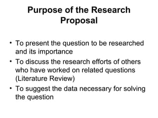 The document discusses the key components and structure of a research proposal. It explains that a research proposal presents the research question, discusses previous related work, and suggests how the researcher will study the problem. A proposal allows the researcher to plan their project and serves as a guide. The document outlines the typical sections of a proposal, including the executive summary, problem statement, research objectives, literature review, importance of the study, research design, data analysis, qualifications, budget, and schedule. It provides guidance on how to write each section to clearly convey the purpose and methodology of the proposed research.