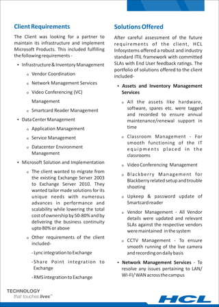 The client is one of the top Business Schools in India established in the 1970s. It has highly accomplished faculty, world-class infrastructure, and motivated students. HCL was selected to transform the client's infrastructure operations, maintain its systems, and implement Microsoft products like migrating from Exchange Server 2003 to 2010 to lower costs and improve business continuity. HCL offered asset management, network management, datacenter management, Microsoft solutions implementation, and help desk services to meet the client's requirements.