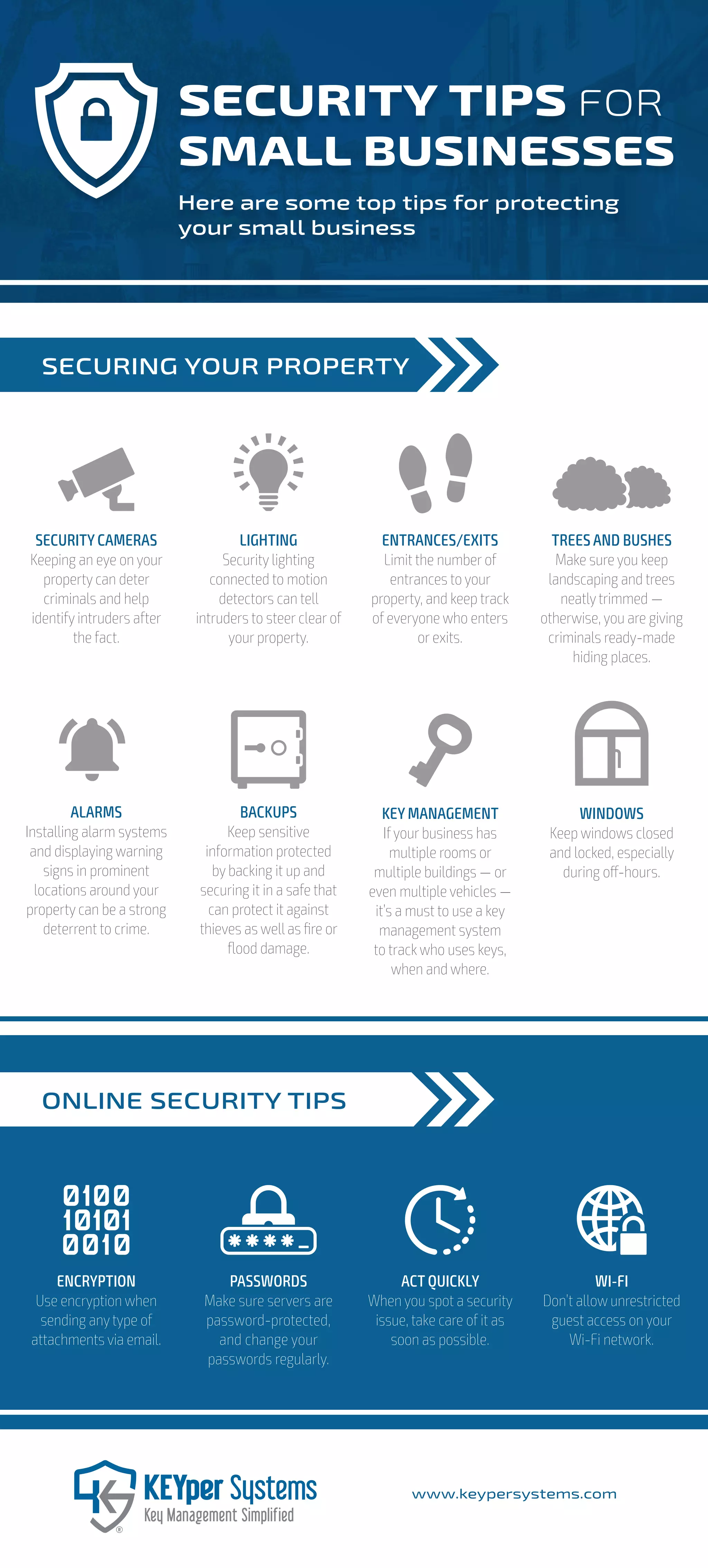 This document provides various tips for improving security for businesses and properties, including using security cameras, alarms, encryption, limiting access points, motion-activated lighting, backing up sensitive files, regularly changing passwords, keeping windows locked, addressing issues promptly, implementing key management systems, restricting guest access to Wi-Fi networks, trimming landscaping, and securing both physical property and online networks. The tips are aimed at deterring crime, identifying intruders, protecting sensitive information and access, and removing places for criminals to hide.