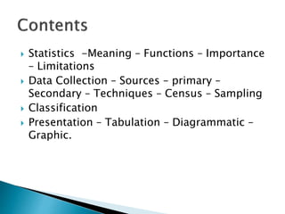This document provides an overview of statistics as a field of study. It discusses the meaning and importance of statistics, as well as data collection methods like census and sampling. Classification, tabulation, and diagrammatic/graphic presentation of data are also covered. The document outlines key statistical concepts like estimation, hypothesis testing, and applications of statistics in various disciplines like industry, commerce, agriculture and more. Common statistical techniques like correlation, regression, probability distributions, and statistical quality control are also mentioned.