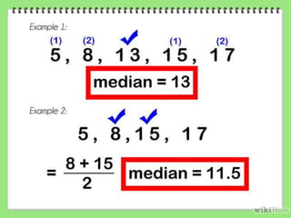 The document discusses the median, including its definition, calculation, merits, and demerits. The median is the middle value of a data set arranged in order. It is calculated by arranging the values from lowest to highest and selecting the middle one. Merits of the median include that it is simple to calculate, unaffected by outliers, and represents typical values. Demerits include that it lacks representativeness for widely dispersed data, is erratic for small data sets, and cannot undergo algebraic treatment. The document also provides formulas for calculating the median of individual series, discrete series, and continuous series.