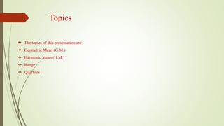 This document provides information about various statistical measures including geometric mean, harmonic mean, range, and quartiles. It defines each measure and provides their formulas. For each measure, it discusses their advantages and disadvantages. An example is provided to demonstrate calculating quartiles, quartile deviation, and other related measures from a set of student marks data.