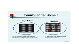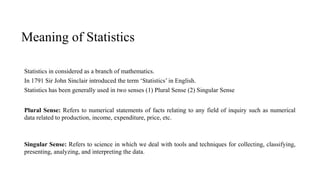 This document provides an overview of business statistics. It defines statistics as a branch of mathematics that deals with collecting, organizing, analyzing, and interpreting numerical data to make effective inferences. Statistics can be descriptive, summarizing data, or inferential, using samples to estimate characteristics of populations. The key types of data are primary, collected directly, and secondary, already existing data collected by others. Data is classified and can be presented in tables, diagrams, and graphs for analysis using measures of central tendency, dispersion, skewness, kurtosis, correlation, regression, and multivariate techniques. Inferential statistics helps estimate population parameters from sample statistics and test hypotheses.