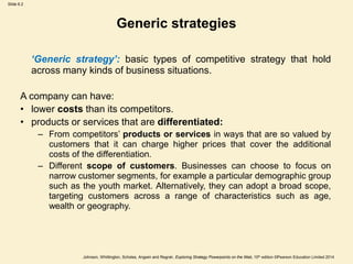 The document outlines various strategic choices and generic strategies that companies can pursue, including cost leadership, differentiation, and focus strategies. It discusses frameworks for analyzing strategies, such as Porter's generic strategies, the strategy clock, and interactive strategies where competitors respond to one another's moves. Game theory and scenarios like the prisoner's dilemma are presented as ways to analyze competitive interactions and strategic interdependence between firms.