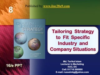 This document discusses strategies for tailoring a company's strategy based on its industry situation. It covers strategies for emerging industries, rapidly growing markets, mature industries, declining industries, high-velocity markets, and fragmented industries. The key strategies discussed include pursuing early leadership, alliances, cost reductions, innovation, international expansion, focus, differentiation, and flexibility. Risks include raising capital, managing rapid growth, responding to competition and changing demand.