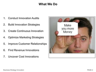 The document outlines the services offered by New Profits, focusing on conducting innovation audits, developing innovation strategies, and optimizing marketing and customer relationships. It emphasizes the importance of fostering a culture of innovation within organizations and aligning innovation goals with corporate strategy. Additionally, it highlights methods for improving marketing outcomes and understanding customer insights to enhance business processes.