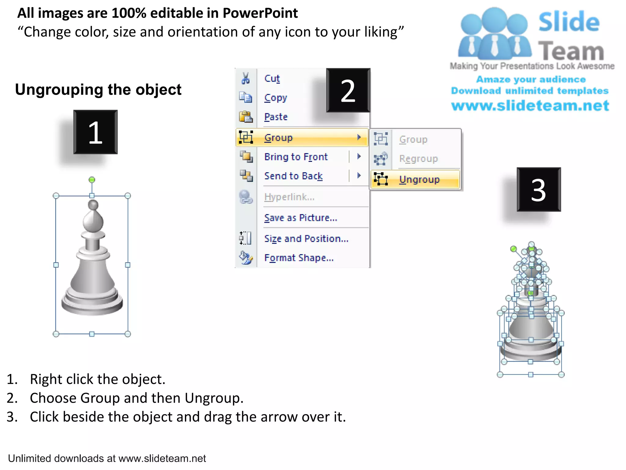 This document provides instructions for editing a chess board diagram downloaded from slideteam.net. It explains how to ungroup objects in the diagram so they can be individually edited. It also explains how to change the color of shapes by right clicking to open formatting options and selecting a new solid or gradient fill color. The document encourages customizing diagrams for presentations to engage audiences.