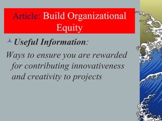 The document discusses several articles on topics related to business strategy and organizational change management. It recommends building organizational equity by gaining social capital, reputation, and relationship equity. A comprehensive change management framework should establish buy-in from executives, address the human side of change, and monitor performance. Top innovation themes that companies rely on include consolidation, bypassing value migration, teaming up, and customization.