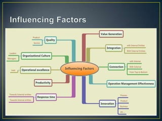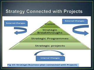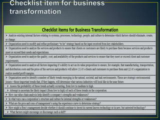 The document discusses several aspects of business transformation and strategic leadership in today's rapidly changing business environment. It emphasizes that organizations must continuously innovate, connect with customers and stakeholders, think strategically about opportunities and risks, develop distinctive competencies, and build an agile culture through training and empowerment in order to achieve competitive advantage and long-term success. Good governance, productivity, responsiveness to market changes, and alignment of projects with corporate strategy are also highlighted as important factors.