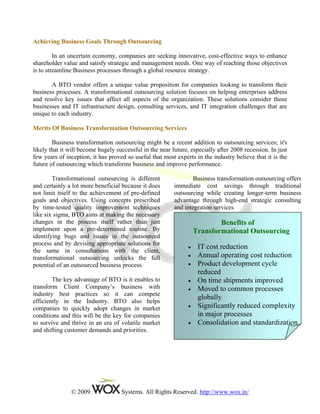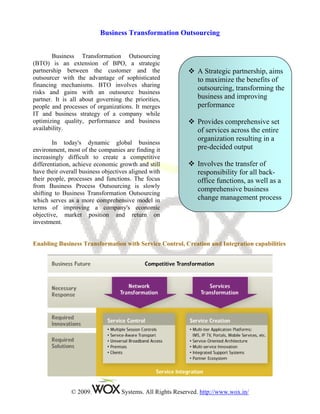 Business Transformation Outsourcing (BTO) enhances traditional Business Process Outsourcing (BPO) by enabling companies to share risks and adapt business processes in response to market changes. BTO aims to optimize organizational performance through strategic partnerships, integrating IT systems, and using industry best practices, while presenting unique risks related to control and intellectual capital. The approach to outsourcing is evolving as businesses seek innovative solutions in the face of a dynamic economic environment.