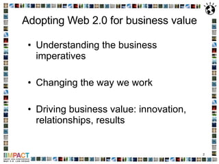This document discusses the adoption of Web 2.0 technologies in business to drive innovation, improve relationships, and enhance results. It highlights the importance of social software in enabling collaboration, knowledge sharing, and improving overall work efficiency. Additionally, it provides insights on successful implementation strategies, including leveraging social networks, fostering a culture of participation, and offering support through training and community-driven approaches.