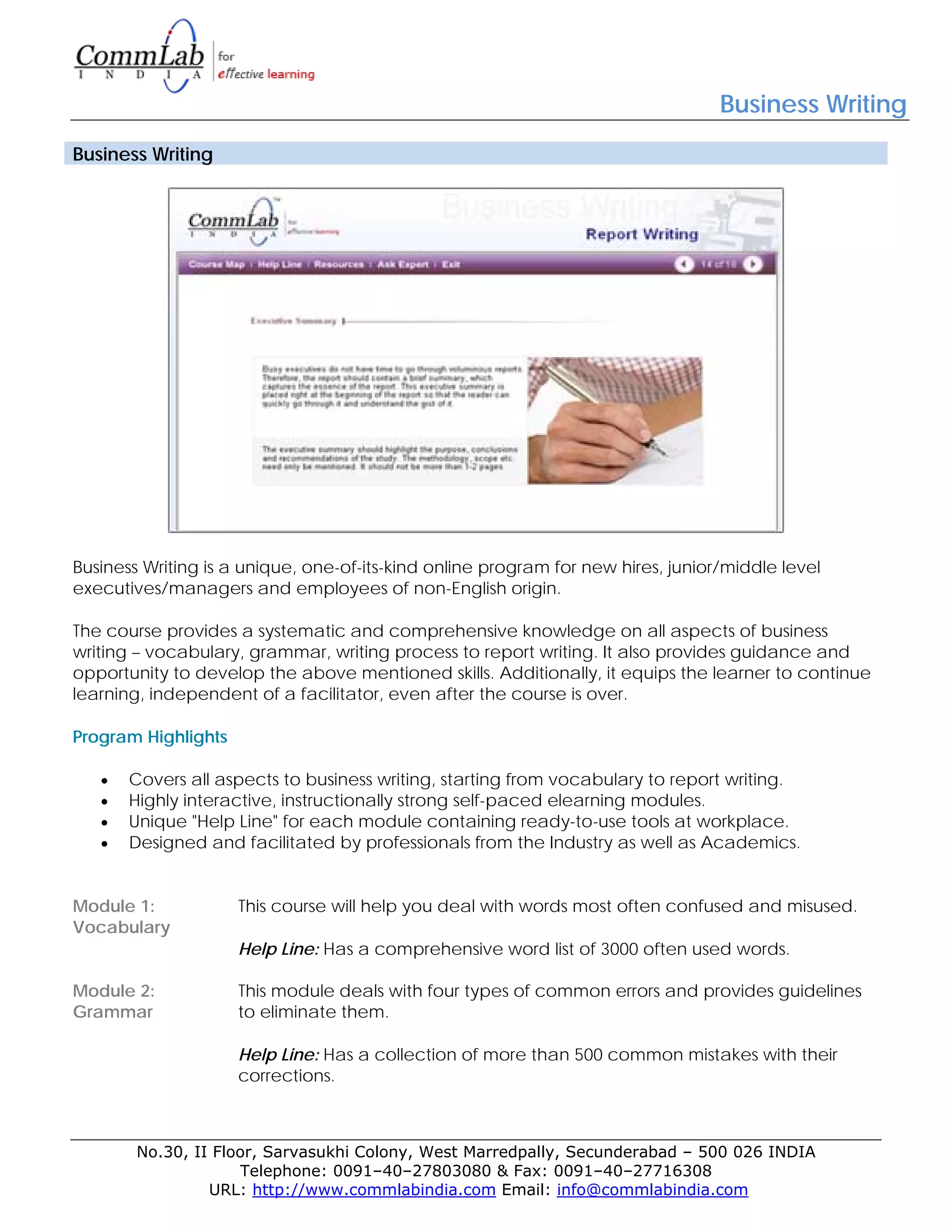 The document outlines a comprehensive online business writing program targeted at new hires and non-English speaking employees, covering all facets from vocabulary to report writing. It features various interactive self-paced modules and help lines to assist learners in improving their writing skills. Additionally, the program is designed by industry professionals and offers resources for continued independent learning.