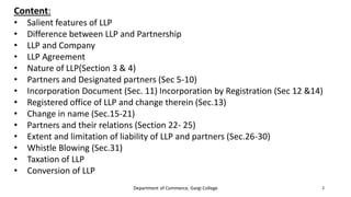 This document provides an overview of the Limited Liability Partnership Act of 2008 in India. It discusses key features of LLPs such as having limited liability like companies but flexibility of management like partnerships. The document outlines the incorporation process for new LLPs including reserving a name, filing incorporation documents, and receiving a registration certificate. It also describes the contents and purpose of an LLP agreement, provisions around an LLP's name and making changes to its name. In summary, the document serves as an introductory guide to the Limited Liability Partnership Act and the process for establishing an LLP in India.