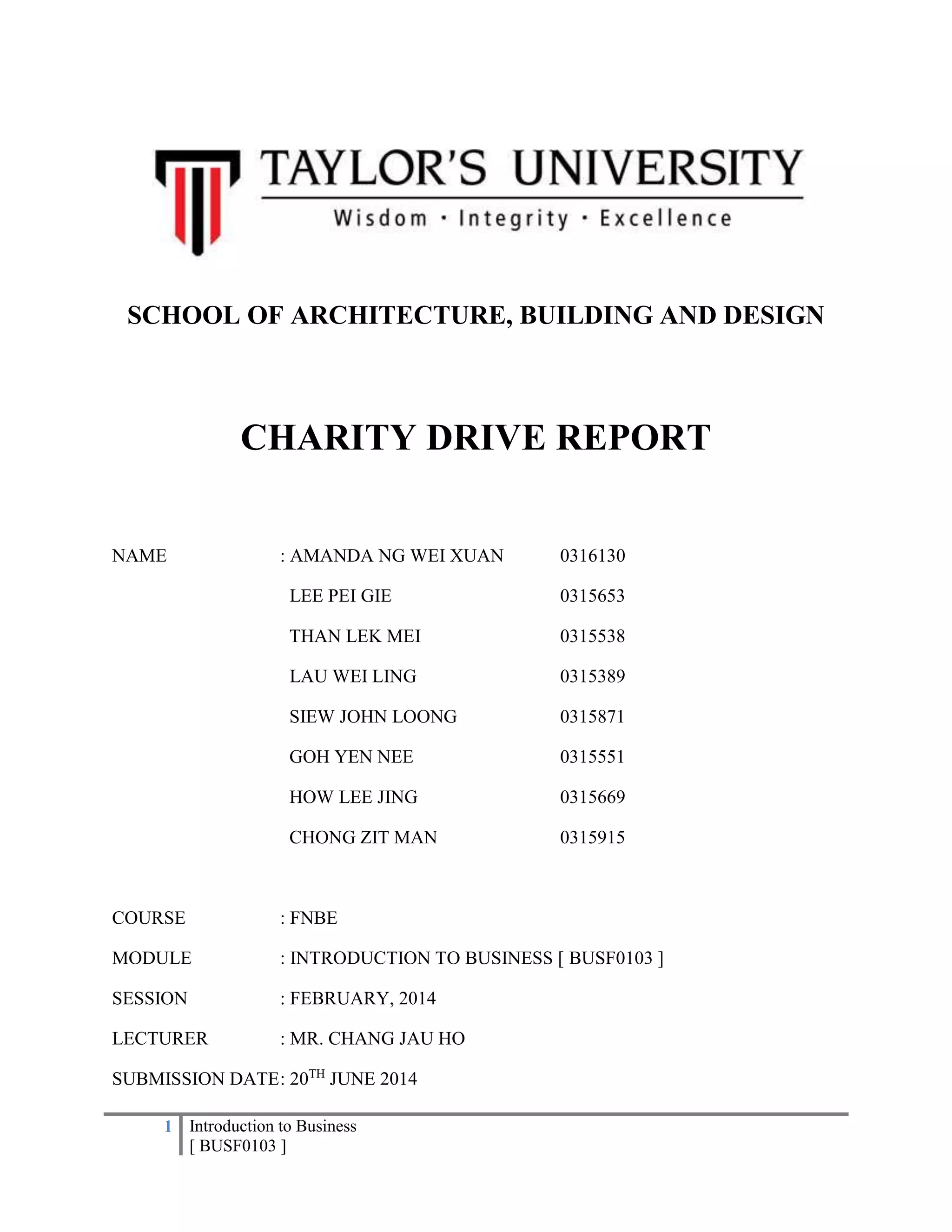 The document provides a report on a charity drive held by students to raise money for Taiwan Buddhist Tzu Chi Foundation Malaysia. The group aimed to raise RM4000 by selling a model calendar and drinks and snacks. They analyzed the target market of university students and competitors' products. The main product was a 2014 model calendar priced at RM25 with promotions. The group promoted through social media and achieved their fundraising goal, donating all profits to the foundation to help victims of natural disasters.