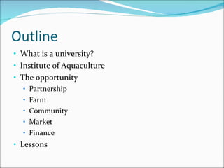 The document summarizes a presentation given by Anton Immink about a partnership between the University of Stirling's Institute of Aquaculture and a fish farm in Uganda called SCAPA Fish Farm. The Institute of Aquaculture has world-leading expertise in aquaculture research and training. The partnership provides opportunities for the university to contribute technical support to the development of Africa's largest fish farm, gain new research and training opportunities, and potentially earn future income. It also benefits the local community in Uganda through jobs, business opportunities, and a new market for fish. Key lessons learned include the need to negotiate intellectual property rights and the importance of proof of success to gain continued management support.
