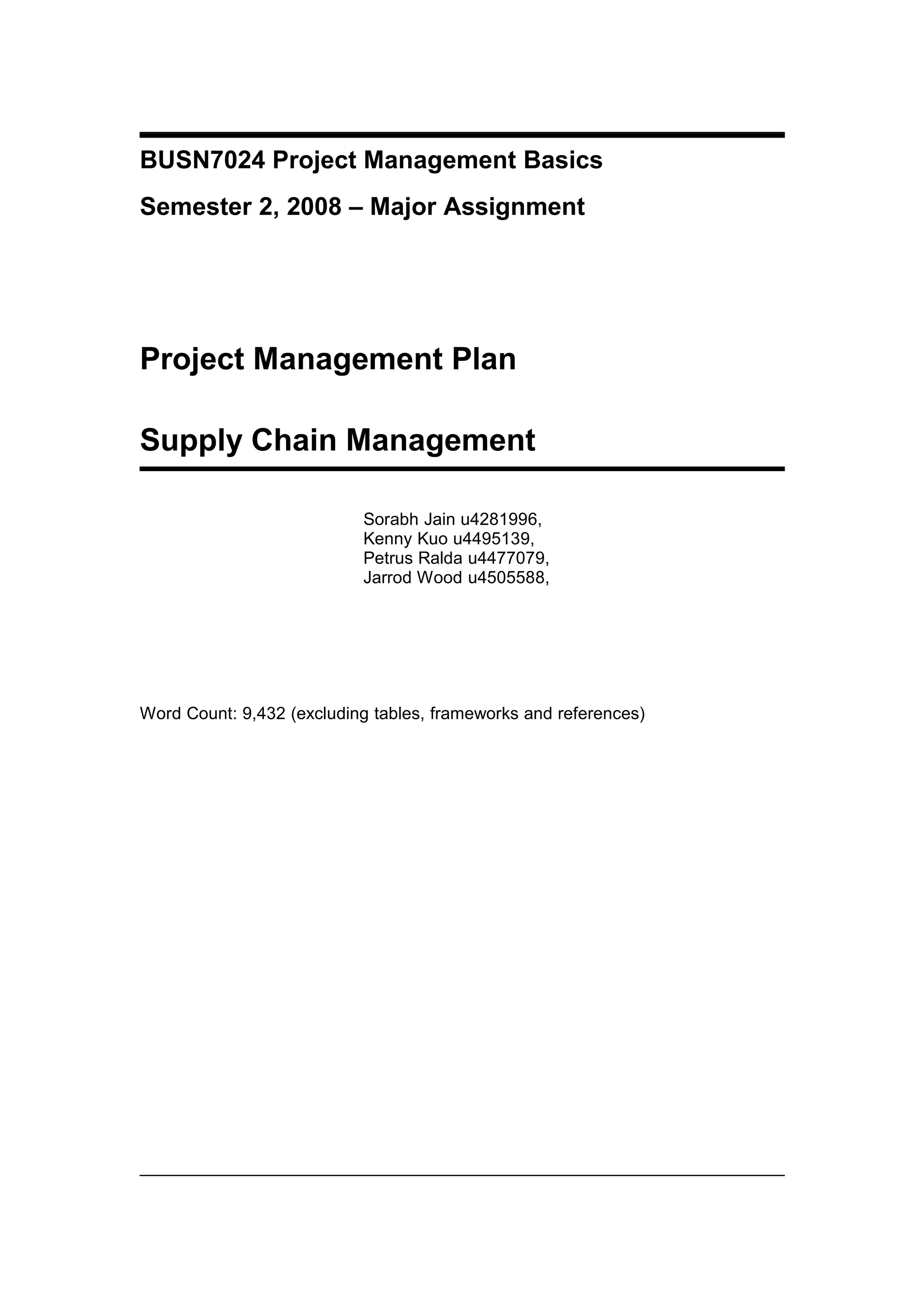 This document provides a project management plan for developing a strategy to secure supply chains and raw materials for producing biofuels. The plan outlines the project scope, integration, time, cost, quality, human resources, communication, risk and procurement management approaches. The project aims to identify raw material sources, logistics, suppliers and ensure ongoing supply for biofuel production. The plan establishes processes for work authorization, change requests, and integrated change control. The performance standard is high given the importance of a sustainable supply chain, and risks include issues with staffing, IT systems and management support.
