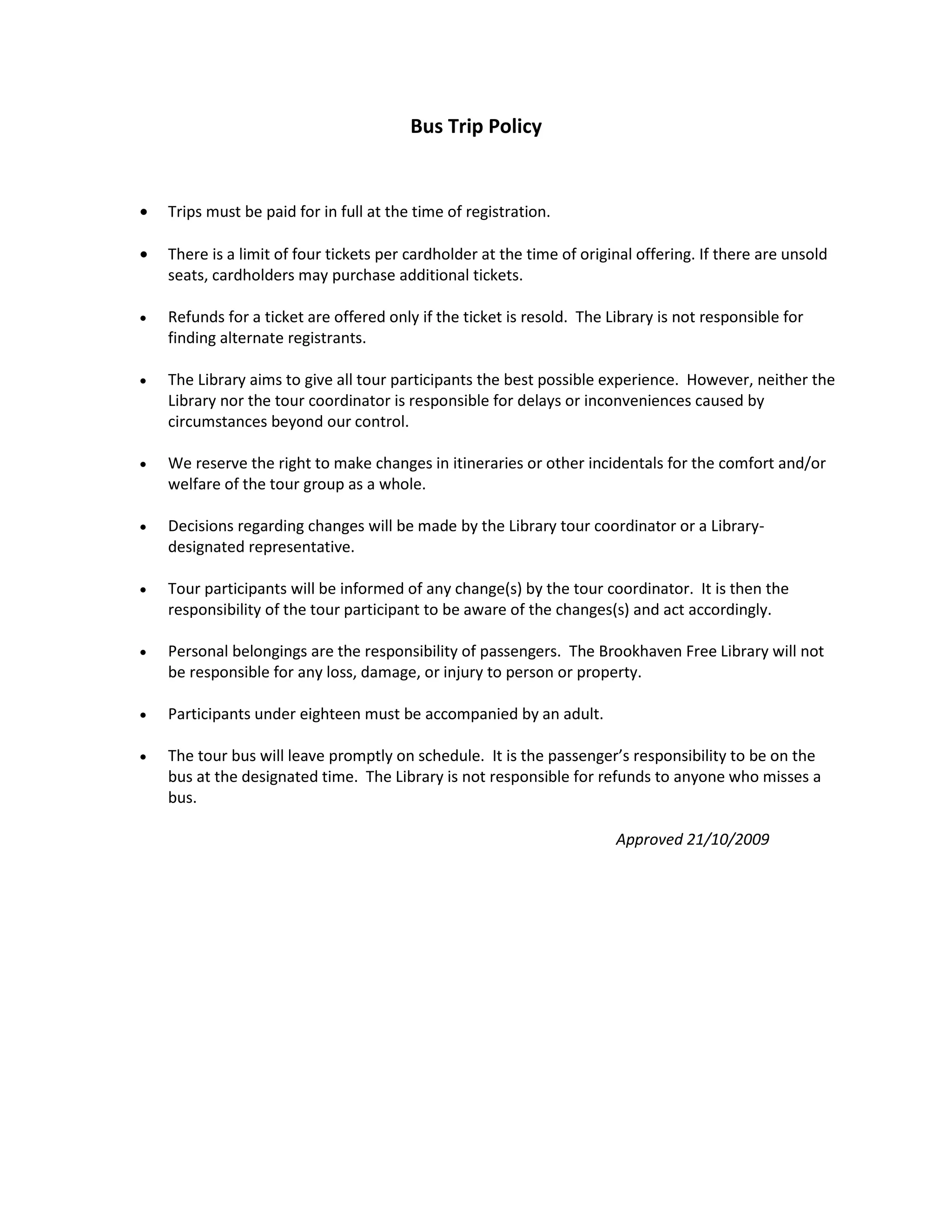 The bus trip policy states that tickets must be paid in full upfront and there is a limit of four tickets per cardholder initially, with the option to purchase more if seats remain. Refunds are only given if the ticket is resold. The library is not responsible for delays outside of their control and reserves the right to make changes for the group's comfort. Participants under 18 must be accompanied by an adult and passengers are responsible for their own belongings. The bus will leave promptly and the library is not responsible for missed departures.