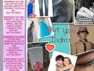 The document is a poem reminiscing on past memories between the poet and their love interest. Each stanza describes a scenario where the poet thought the person would be angry or drop them, but they did not. The poet reflects on how this person put up with them and loved them through many things, leaving the reader with a sense of nostalgia and regret from the poet over lost love.