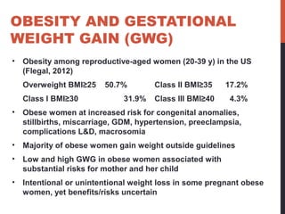 The document provides guidelines for gestational weight gain in obese pregnant women. It summarizes that the majority of obese women gain weight outside existing guidelines, and both low and high gestational weight gain are associated with risks for mother and child. The 2009 Institute of Medicine guidelines recommend a weight gain range of 5 to 9 kg for obese pregnant women, though data on optimal gain levels according to obesity severity are still limited. Some studies have found benefits of minimal or no weight gain for more severely obese women, though larger studies are still needed.
