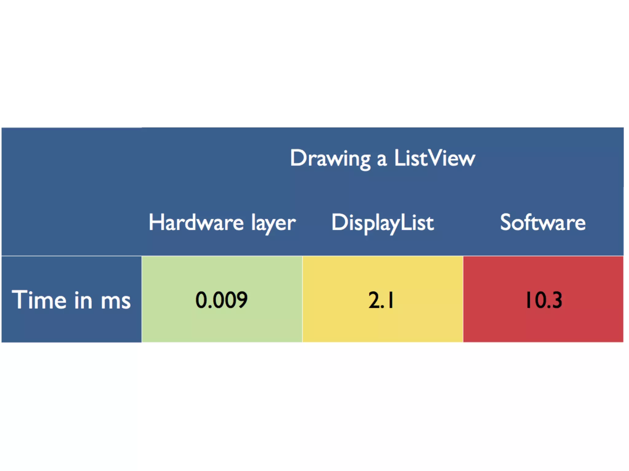 FBO에 저장. (FrameBufferObject) ● 한정된 영역. ● view.setLayerType (View.LAYER. HARDWARE, null) 소프트웨어 레이어: ● 비트맵 보관 ● view.setLayerType (View.LAYER. SOFTWARE, null)