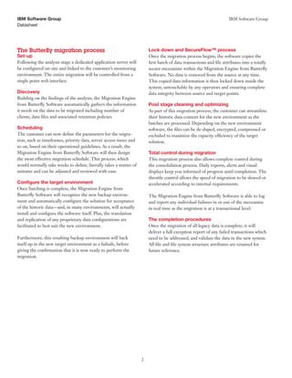 The Migration Engine from Butterfly Software is a software solution that facilitates the automated consolidation of historic compliance data from legacy backup environments onto a single backup platform. It utilizes intelligent automation to safely migrate all data files and attributes in a strictly defined process with complete risk mitigation. The migration process involves discovery of data to migrate, scheduling backups in batches according to priorities, configuring the target environment, securely transferring data batches to the new backup platform, and validating the data and decommissioning legacy systems once complete. The Migration Engine provides total control and scalability during the migration process to optimize storage capacity and quickly transfer data with zero risk.