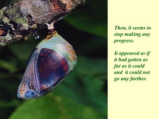 The document tells a story about a man who helps a butterfly emerge from its cocoon by cutting it open with scissors. However, the butterfly's body is shriveled and wings are small, preventing it from flying. Struggling to emerge from the cocoon forces fluid into the wings, making them strong enough for flight. Sometimes struggles are necessary for growth, and asking God for certain things may result in difficulties that provide what is truly needed.