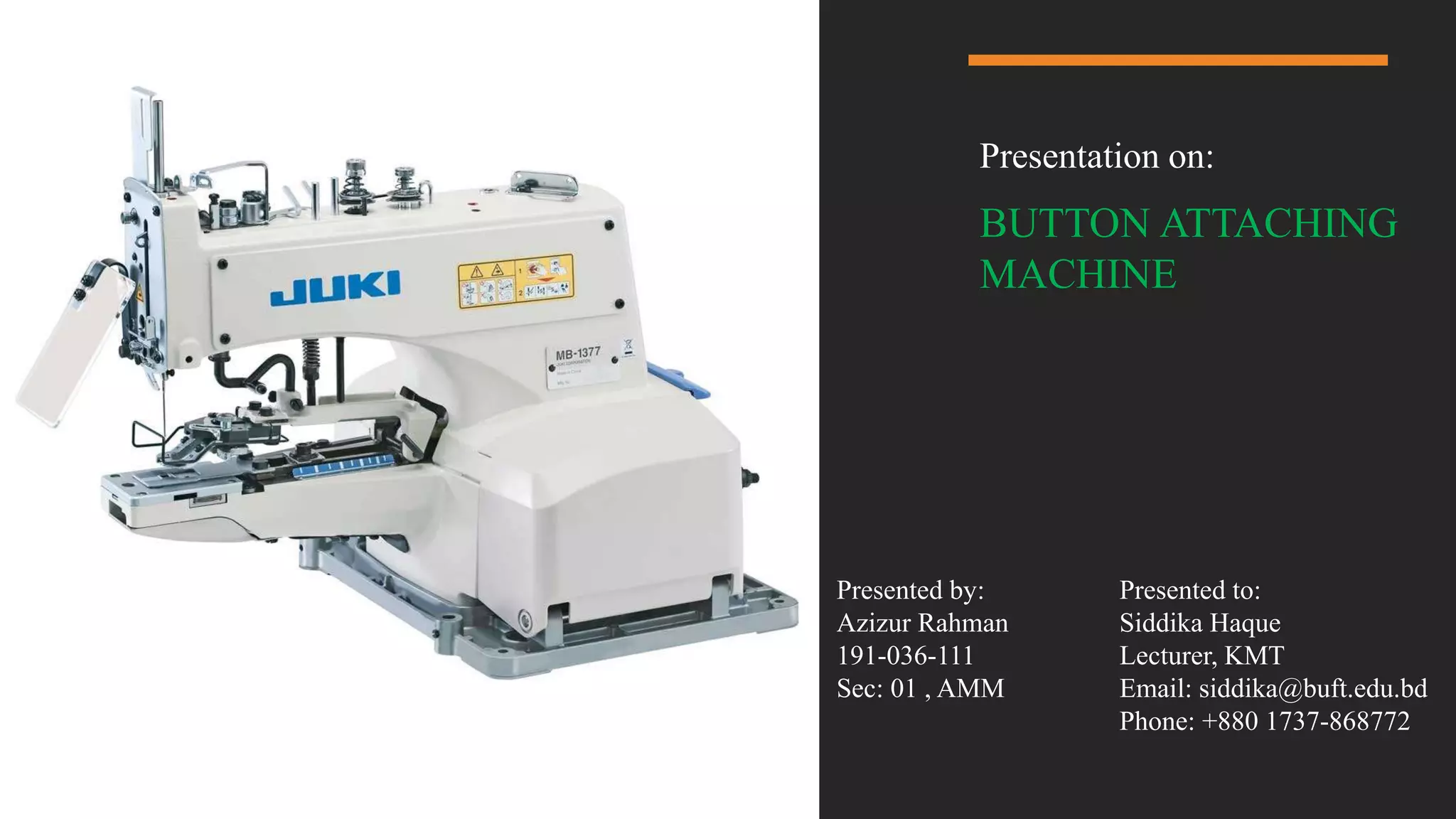 Button attaching machines are used in garment industries to automatically attach buttons. Juki is a leading manufacturer of button attaching machines, such as the MB-377 model. Button attaching machines have parts like a pulley, button clamp, and operation panel. They can attach buttons using chain or lock stitch and feed buttons automatically. Proper safety precautions must be followed when using button attaching machines to prevent injuries.