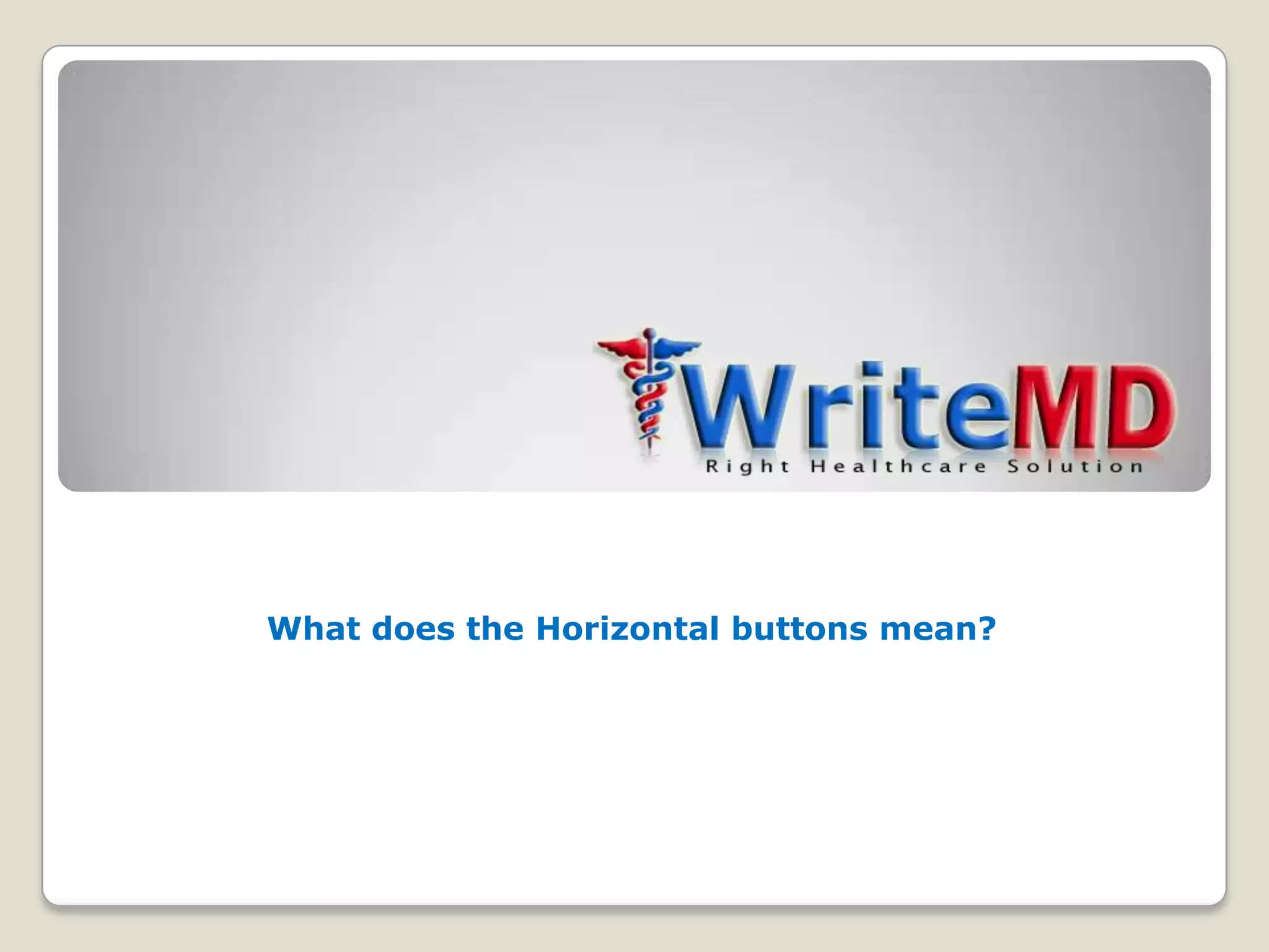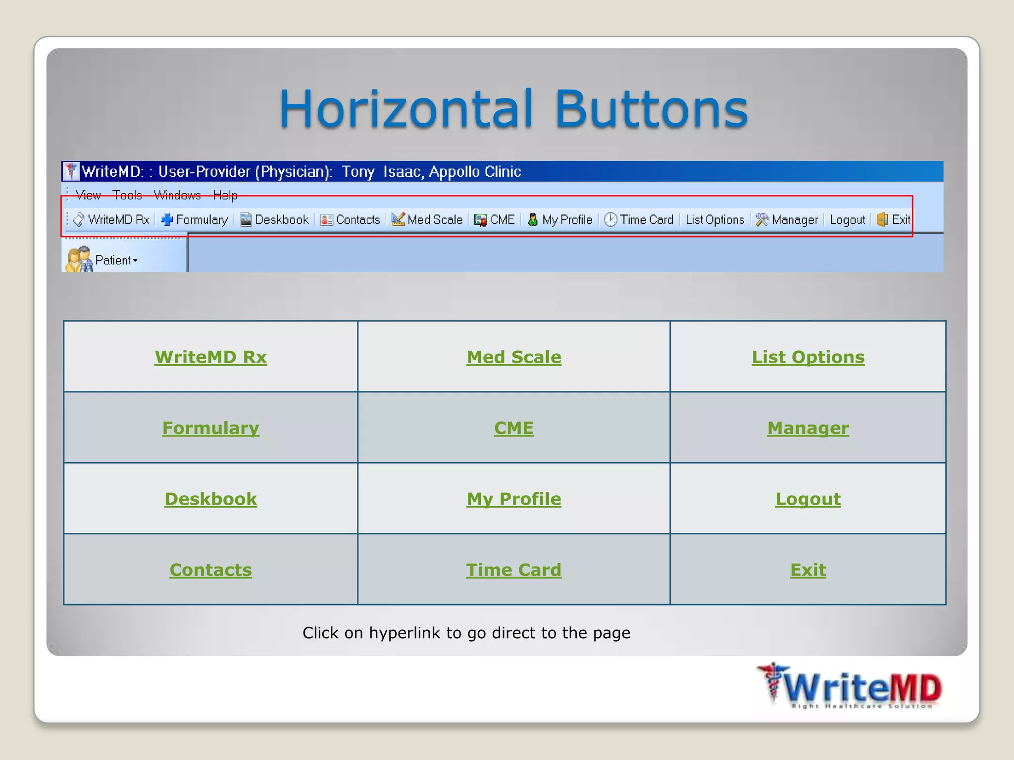The document describes the various horizontal buttons and pages accessible from the main menu in a electronic health record (EHR) system, including pages for medication lookup, formularies, documents, provider contacts, medical calculations, continuing medical education, user profiles, time tracking, customization options, system administration, logging in and out, and contact information. The buttons provide access to key functional areas and data within the EHR.