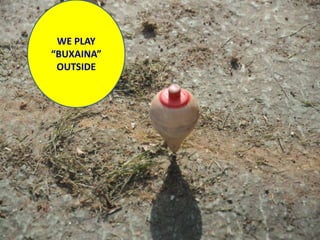 We play a game called "Buxaina" outside where we make figures dance using strings tied to them. The rules are that a circle is drawn on the ground and players take turns making their Buxaina figure dance inside the circle for as long as possible, with the player keeping their figure dancing the longest being declared the winner.
