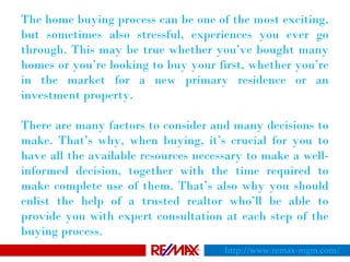 The home buyer's guide outlines the crucial steps and considerations involved in the home buying process, emphasizing the importance of making informed decisions and seeking assistance from a trusted realtor. It covers aspects such as determining the right house size and type, choosing a suitable location, evaluating neighborhood amenities, affordability, lifestyle requirements, and resale value. Additionally, it provides guidance on property title verification, evaluating real estate developers, understanding sale agreements, and addressing stamp duty regulations.