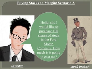 The document outlines the concept of buying stocks on margin through two scenarios involving a stock broker and an investor. In the first scenario, the investor profits significantly from the rise in stock prices, while in the second scenario, the investor suffers losses and still owes money despite the decrease in stock value. This highlights the risks and rewards of margin trading in the stock market.