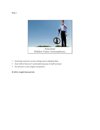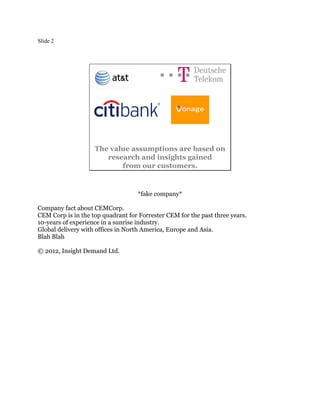 The document presents a case study about a company called Verizon that was facing declining customer service ratings due to delayed customer feedback data. There was an 8-week delay in receiving customer service ratings, which hindered the ability to make timely improvements. The CEO challenged the manager Paul to find a solution to access real-time customer data. Paul was referred to CEMCorp, a company that could immediately funnel real-time customer data to frontline agents, allowing improvements to be made quickly. Within 30 days of using CEMCorp's services, Verizon's overall customer experience scores increased by 6%.