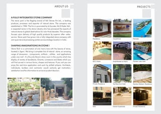 The document is a product catalog for Vali Stones Pvt Ltd, showcasing their flagship brand 'Stone Park' which specializes in natural stones. Established in 1984, the company operates showrooms and processing centers in India and offers a wide variety of stone products including granite, limestone, and sandstone. It highlights several notable projects and promotes its commitment to quality and customer service.