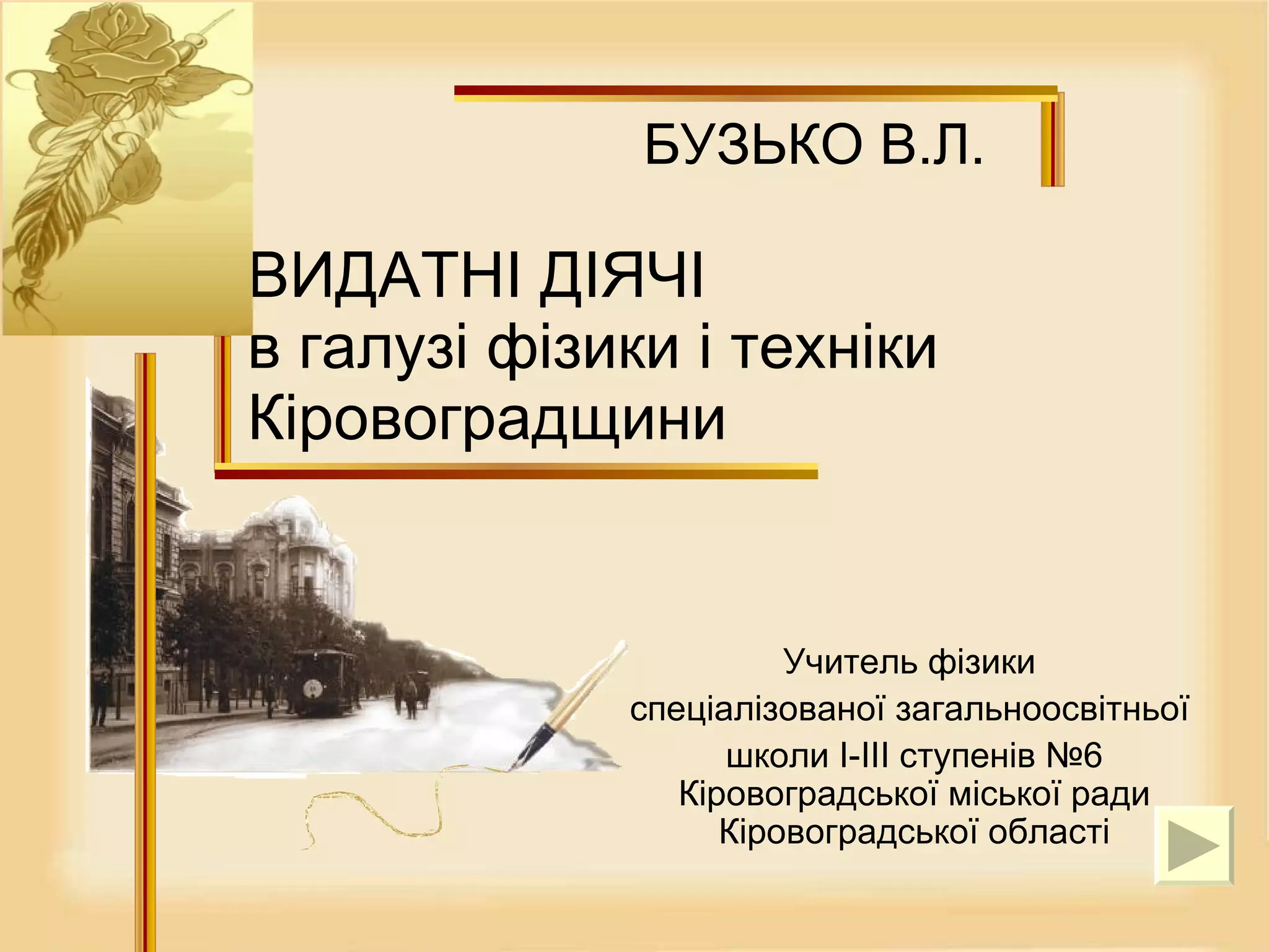 ВИДАТНІ ДІЯЧІ в галузі фізики і техніки Кіровоградщини БУЗЬКО В.Л. Учитель фізики спеціалізованої загальноосвітньої школи I-III ступенів №6 Кіровоградської міської ради Кіровоградської області