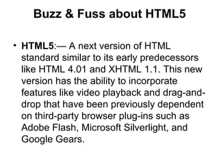 HTML5 introduces several new elements and attributes that provide capabilities previously only available through third party plugins like Flash. The canvas element allows dynamic drawing and graphics, the video element embeds video without Flash, and offline web applications allow interaction without an internet connection. Geolocation detects the user's physical location. While Flash remains powerful, HTML5 has wider acceptance since it runs natively in browsers without plugins and is free unlike Flash's development costs. The future of web development likely belongs to HTML5.