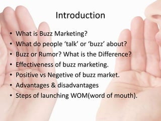 Buzz marketing is a low-cost marketing technique that relies on word-of-mouth recommendations to generate interest in a product or service. It works by identifying influential customers to try a product and encourage them to talk about their experience with others in their social networks. Buzz marketing can be an effective way to reach many potential customers faster than traditional advertising. However, companies have little control over buzz marketing and there is a risk of negative word-of-mouth spreading. The document provides examples of successful buzz marketing campaigns and discusses challenges in sustaining buzz over the long term.
