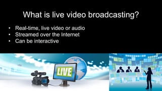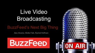Live video broadcasting allows for real-time streaming of video and audio over the Internet. It can increase brand recognition and engagement through interactive features. BuzzFeed is considering adopting livestreaming to continue competing with other media outlets and keep up with trends, as people enjoy watching video content. Livestreaming could help BuzzFeed with community engagement and entertainment/news coverage by enabling live discussions and faster breaking news coverage. Condé Nast could also adopt livestreaming to broadcast events live from their websites and apps. While disruptive to some industries, livestreaming is becoming a major trend for sharing information and interacting with audiences.
