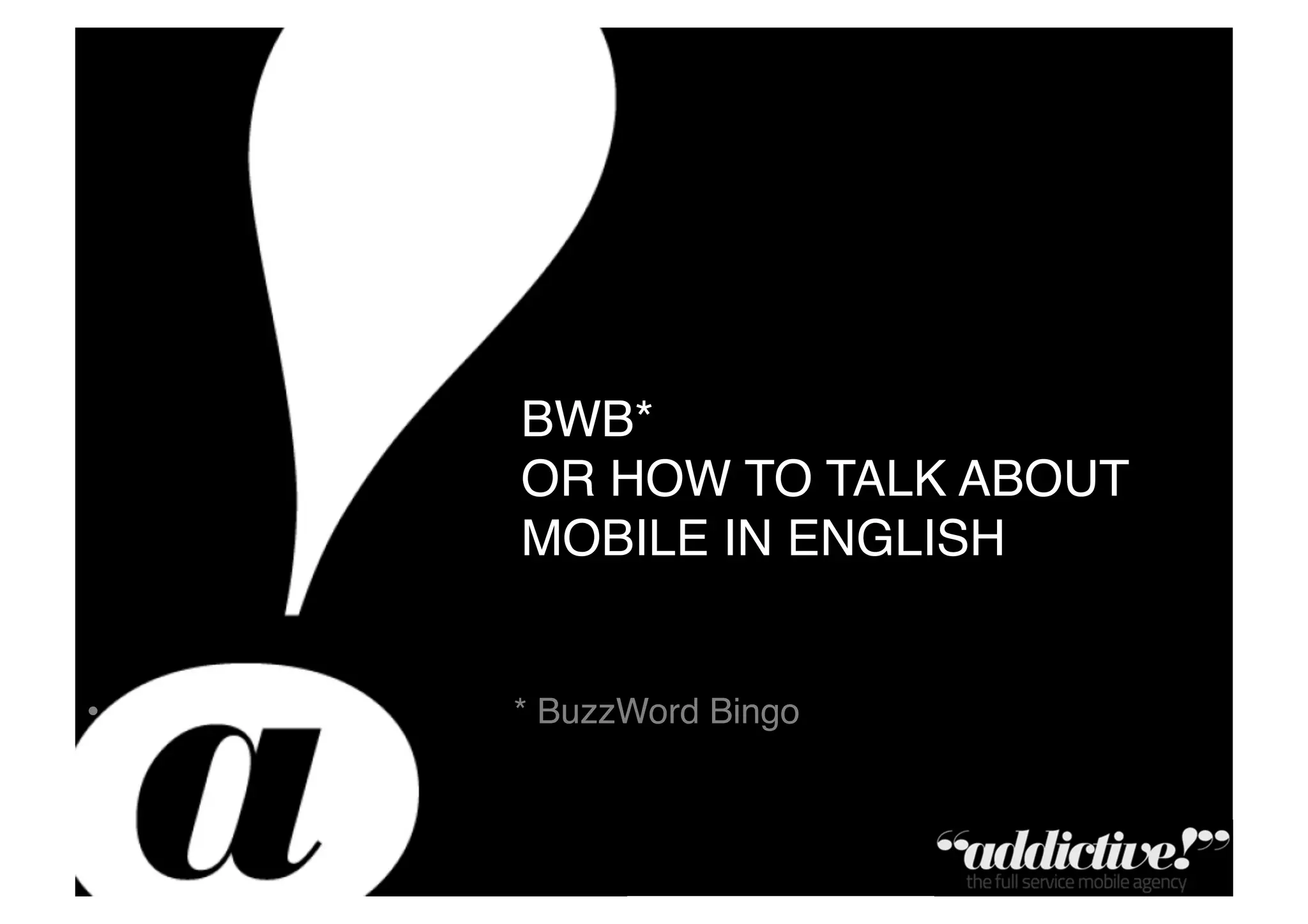 The document contains a compilation of various buzzwords and concepts related to mobile technology and digital innovation, such as gamification, the Internet of Things, augmented reality, and cloud computing. It includes links to Wikipedia articles and other resources for further exploration of these topics. Additionally, it highlights trends in mobile traffic, particularly the predicted reliance on Wi-Fi and caching in future devices.