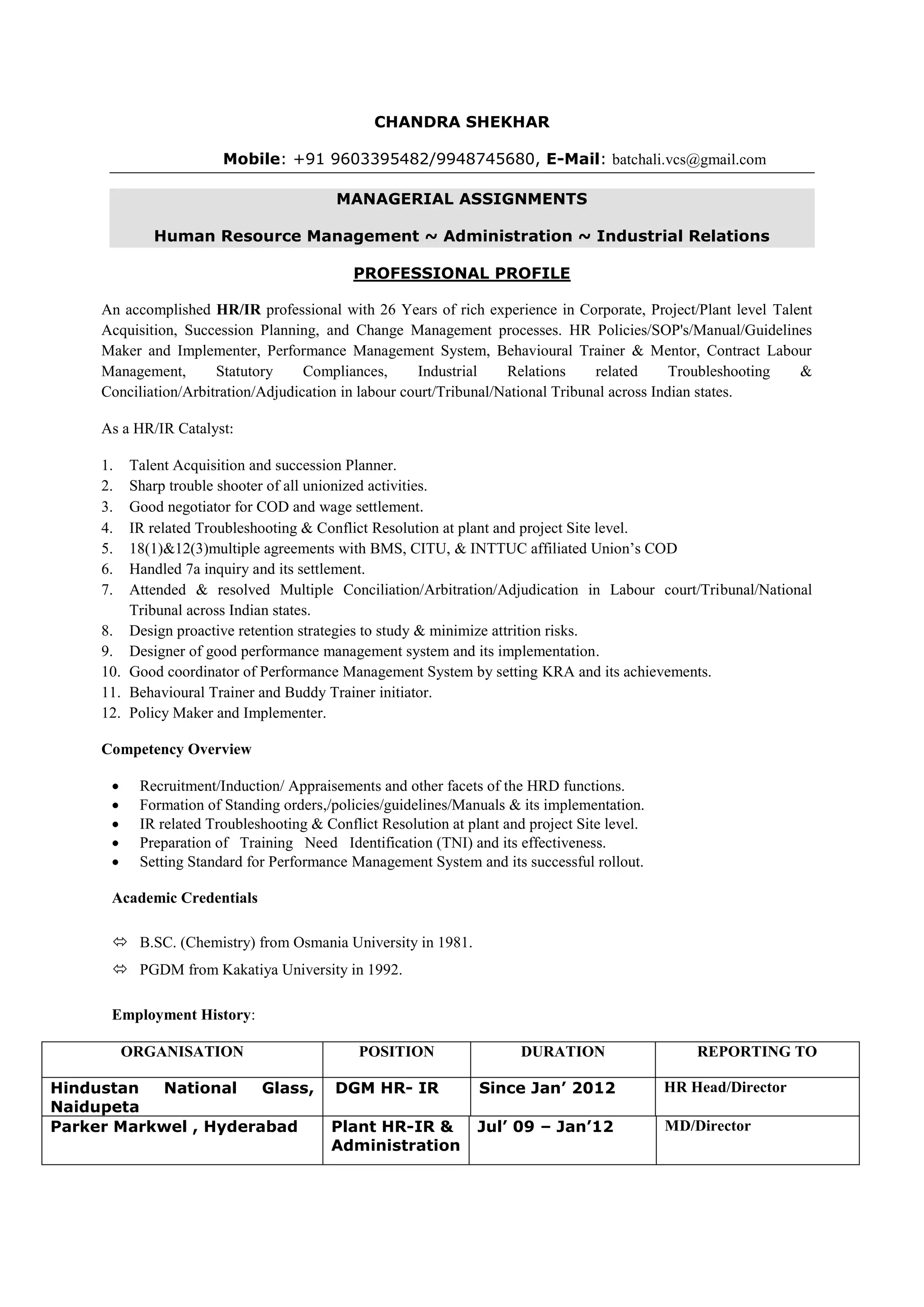 This document contains the resume of Chandra Shekhar, an experienced HR and industrial relations professional with over 26 years of experience in talent acquisition, performance management, training, compensation and benefits, and industrial relations. He has held various HR leadership roles across several organizations in industries like cement, glass, pharmaceuticals, and automotive. Currently seeking a new opportunity, he is looking to leverage his expertise in managing all aspects of the HR function, including employee productivity, change management, and statutory compliances.