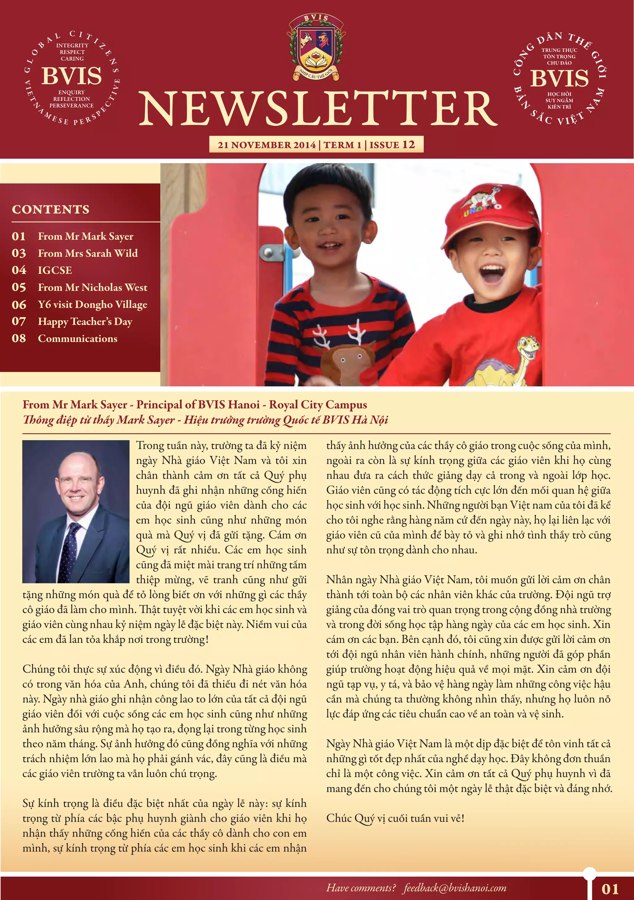 Thầy Mark Sayer, hiệu trưởng trường BVIS Hà Nội, cảm ơn các giáo viên và nhân viên nhân Ngày Nhà Giáo Việt Nam, nhấn mạnh vai trò quan trọng của họ trong sự phát triển của học sinh và cộng đồng trường. Ông cũng ghi nhận những món quà và tình cảm từ phụ huynh dành cho giáo viên, đồng thời khuyến khích sự tôn trọng lẫn nhau giữa giáo viên và học sinh. Sự kiện kỷ niệm này không chỉ tôn vinh nghề dạy học mà còn làm nổi bật trách nhiệm của giáo viên trong việc hình thành cuộc sống và tương lai của học sinh.