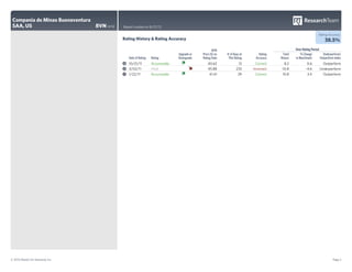 The ResearchTeam has changed its rating on Compania de Minas Buenaventura SAA (BVN) 13 times in the past 19 months. Of those 13 ratings, the direction of the stock price movement was correct only 5 times, giving the ResearchTeam a rating accuracy of 38.5%. The current rating on BVN from ResearchTeam is Reduce, downgraded from Hold 24 days ago. Since the downgrade, the stock price has fallen 2.6%.