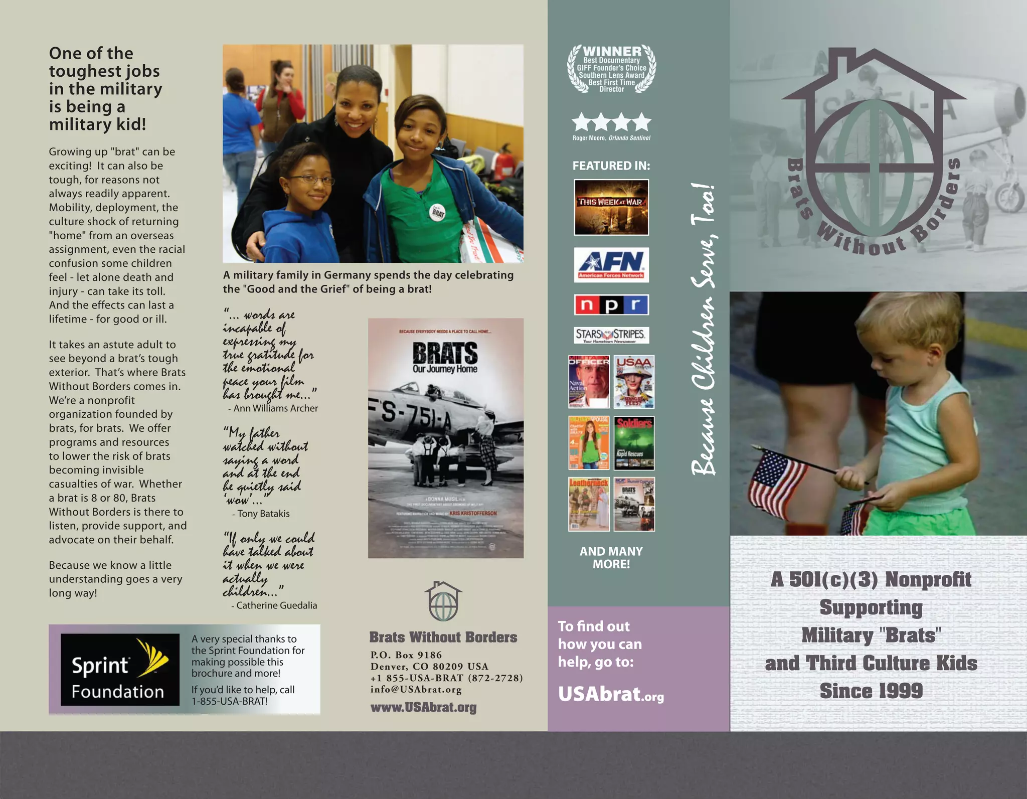 The document discusses the challenges that children of military families ("brats") face from frequent mobility and deployment of parents. It introduces Brats Without Borders, a nonprofit organization founded by former brats that provides programs and resources to help brats cope with the stresses of military life and feel less isolated in their experiences. The organization collects experiences of brats to understand their needs and offers a variety of materials including a documentary, books, workshops, and other resources to educate brats, their families, and communities about brat culture.