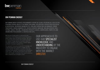 BW Penman Energy is an international recruitment specialist focused on the energy sector. They operate within the upstream oil and gas sector, covering exploration and production, drilling contracting, oilfield services, engineered products, and engineering procurement and construction. They work with energy companies globally to provide mid-to-senior level talent through their extensive network and specialist knowledge of the industry. Their services include contingency and retained recruitment to match candidates with clients' needs.