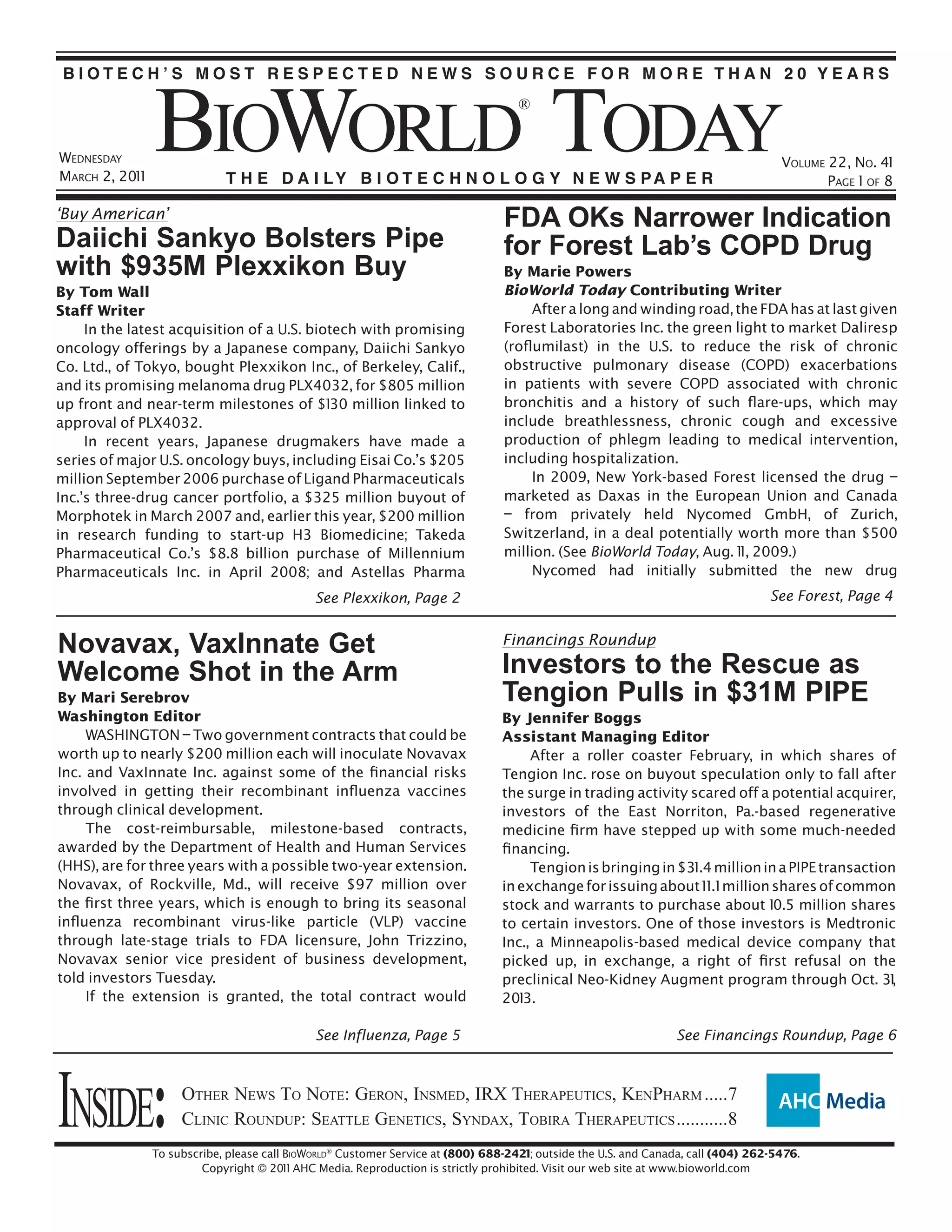 - Daiichi Sankyo acquired Plexxikon and its promising melanoma drug PLX4032 for $805 million upfront plus $130 million in milestones linked to drug approval.